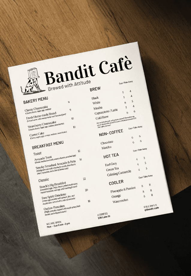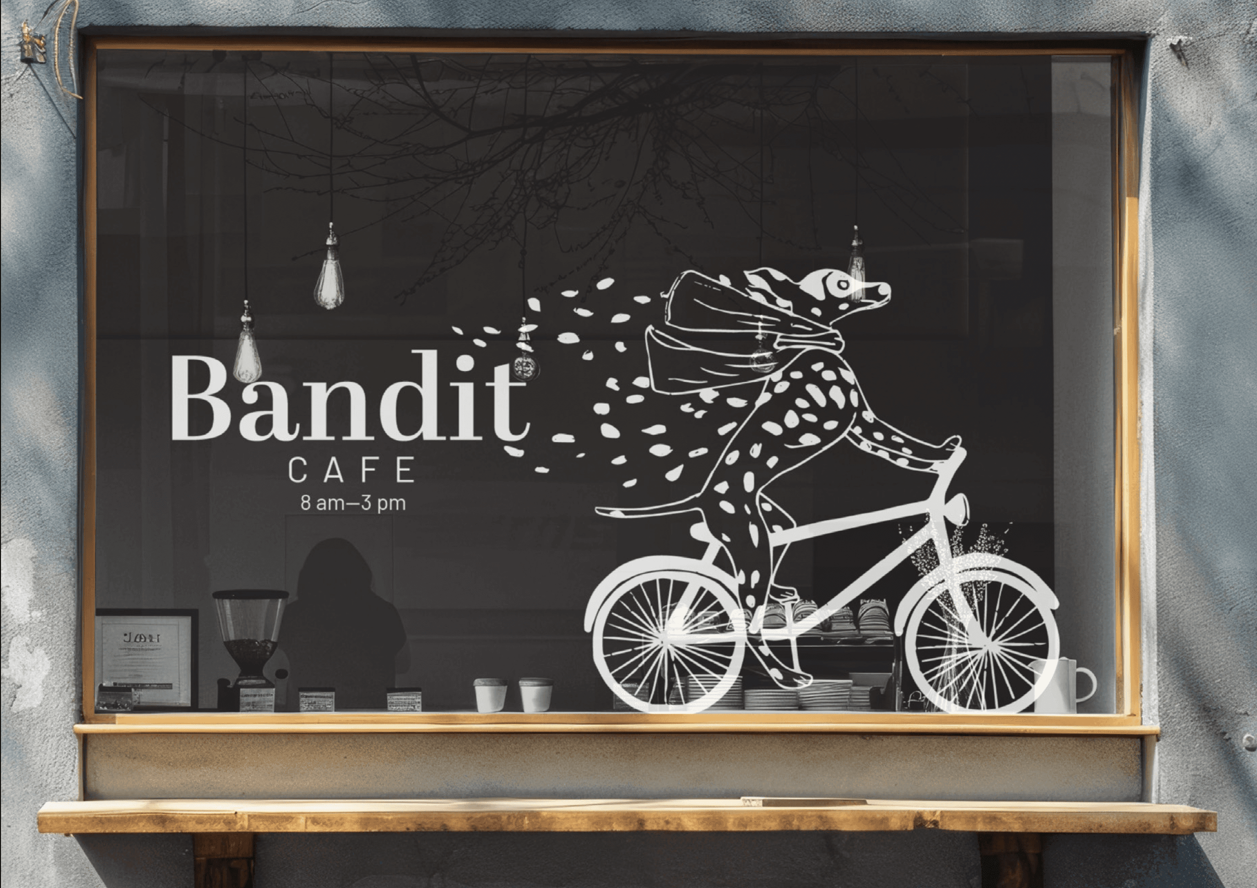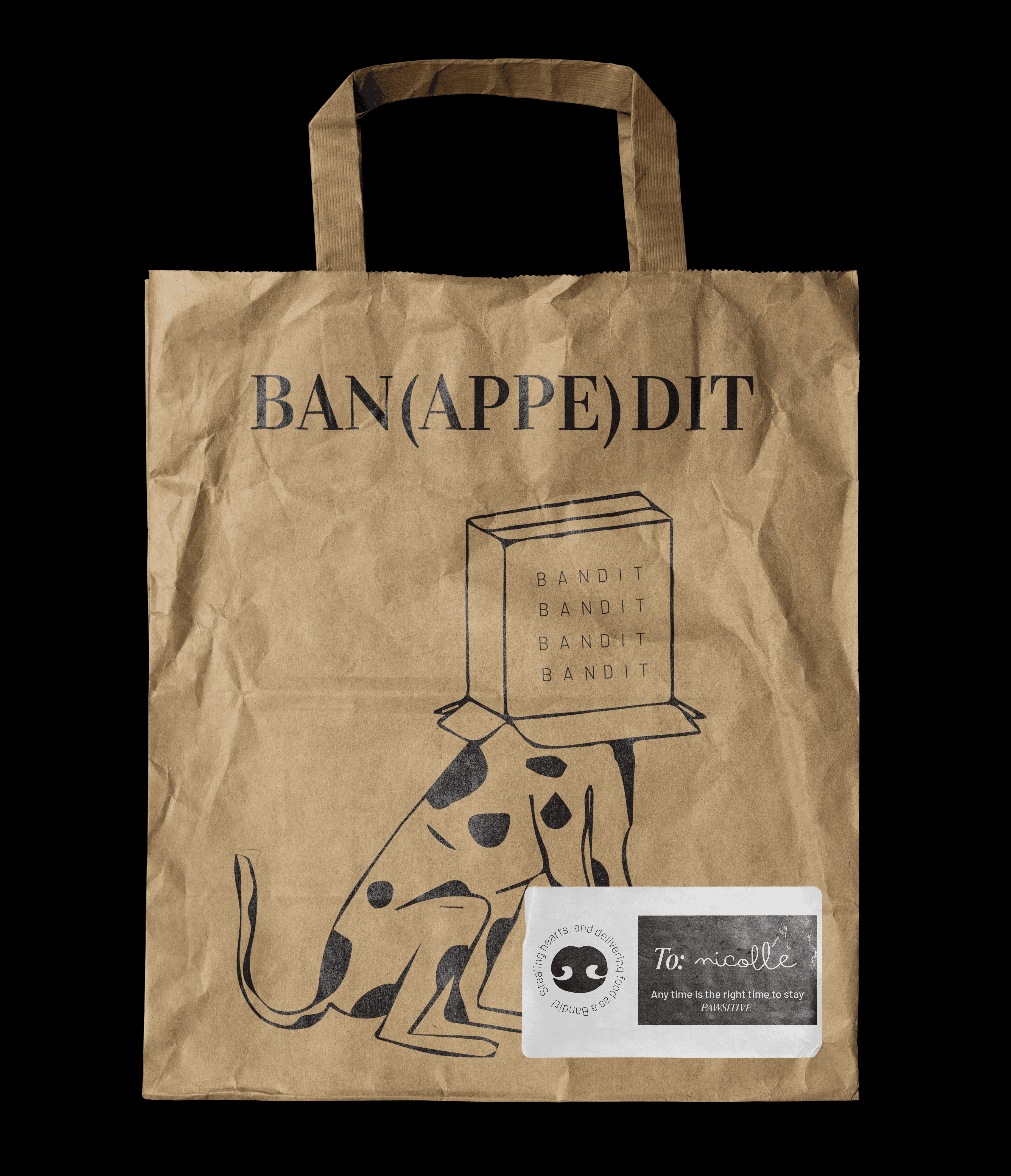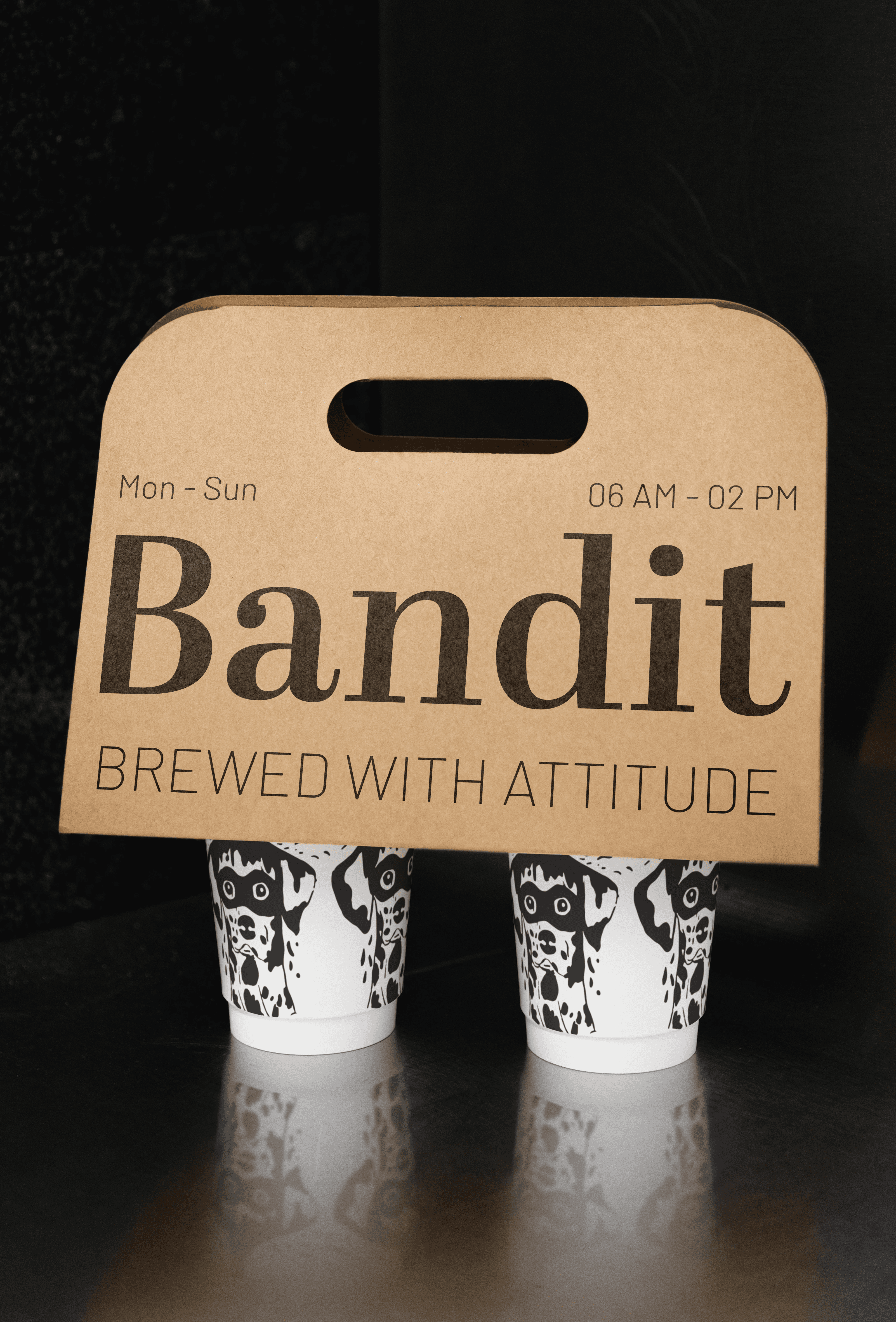 "Bandit Café" is a pet-friendly coffee concept that stands out from traditional cafés by embracing a cheeky, playful personality while maintaining a sense of sophistication. The goal was to create a welcoming brand for both coffee lovers and their furry companions.